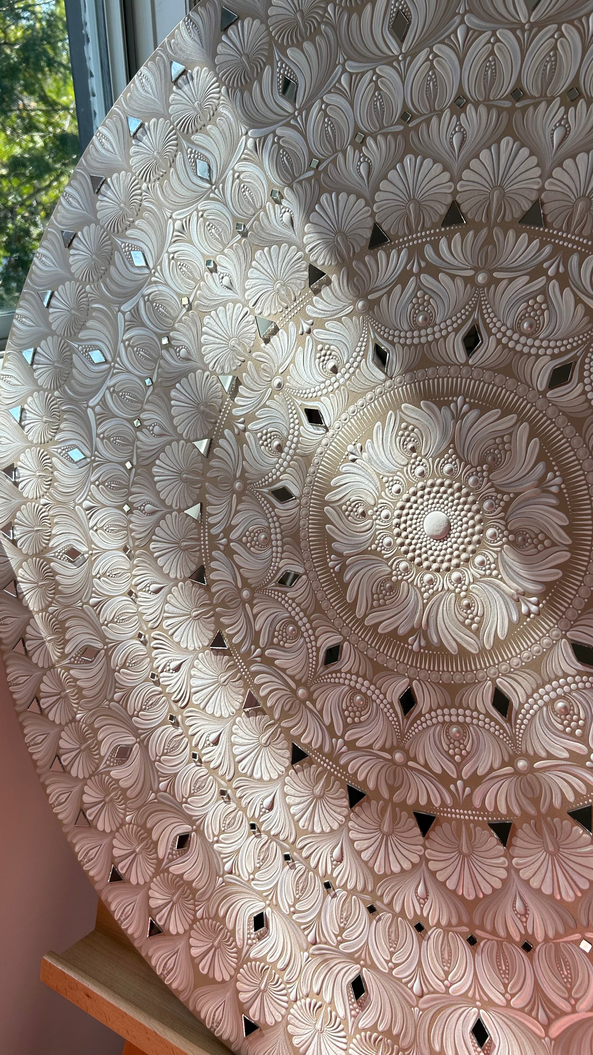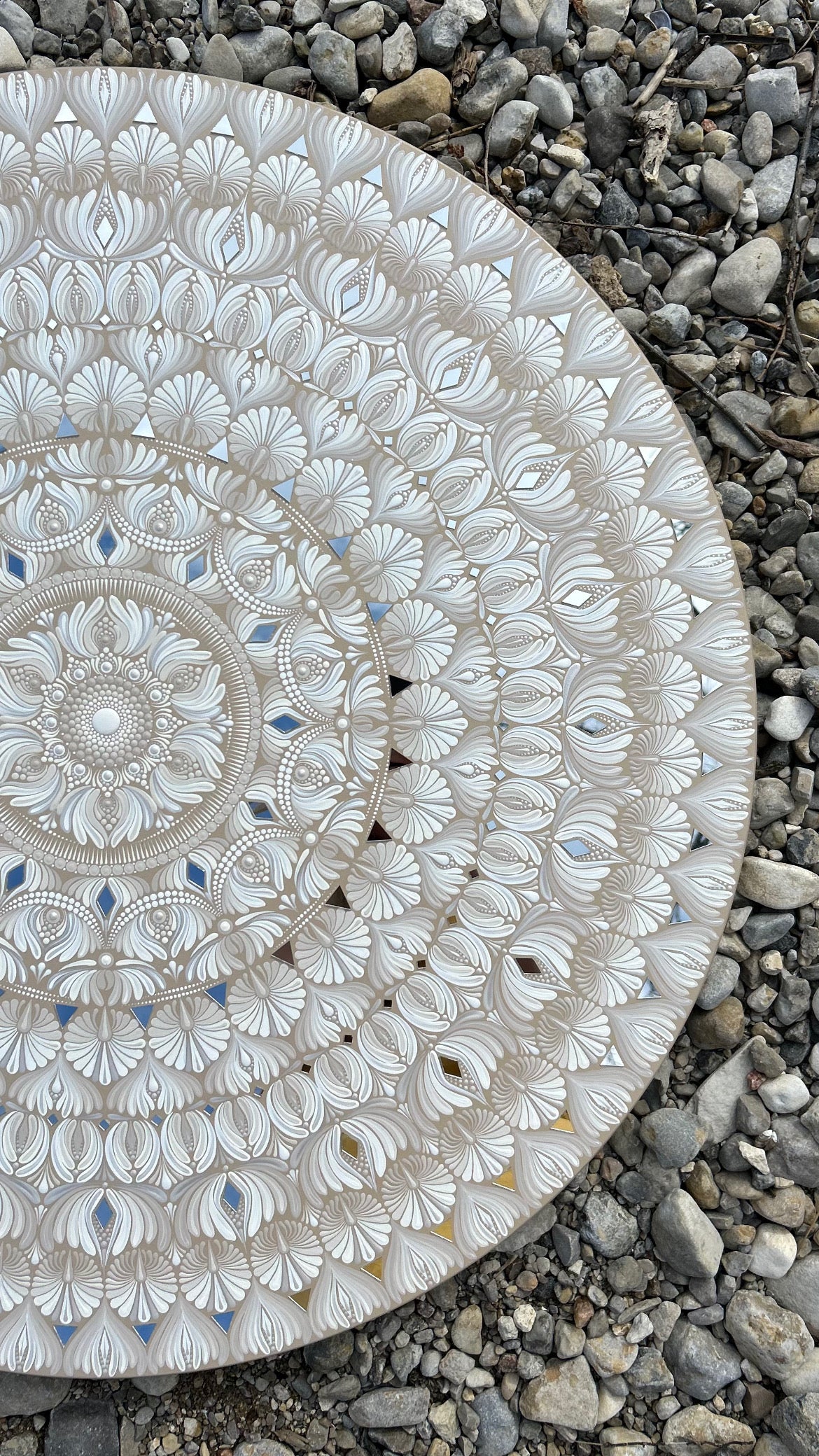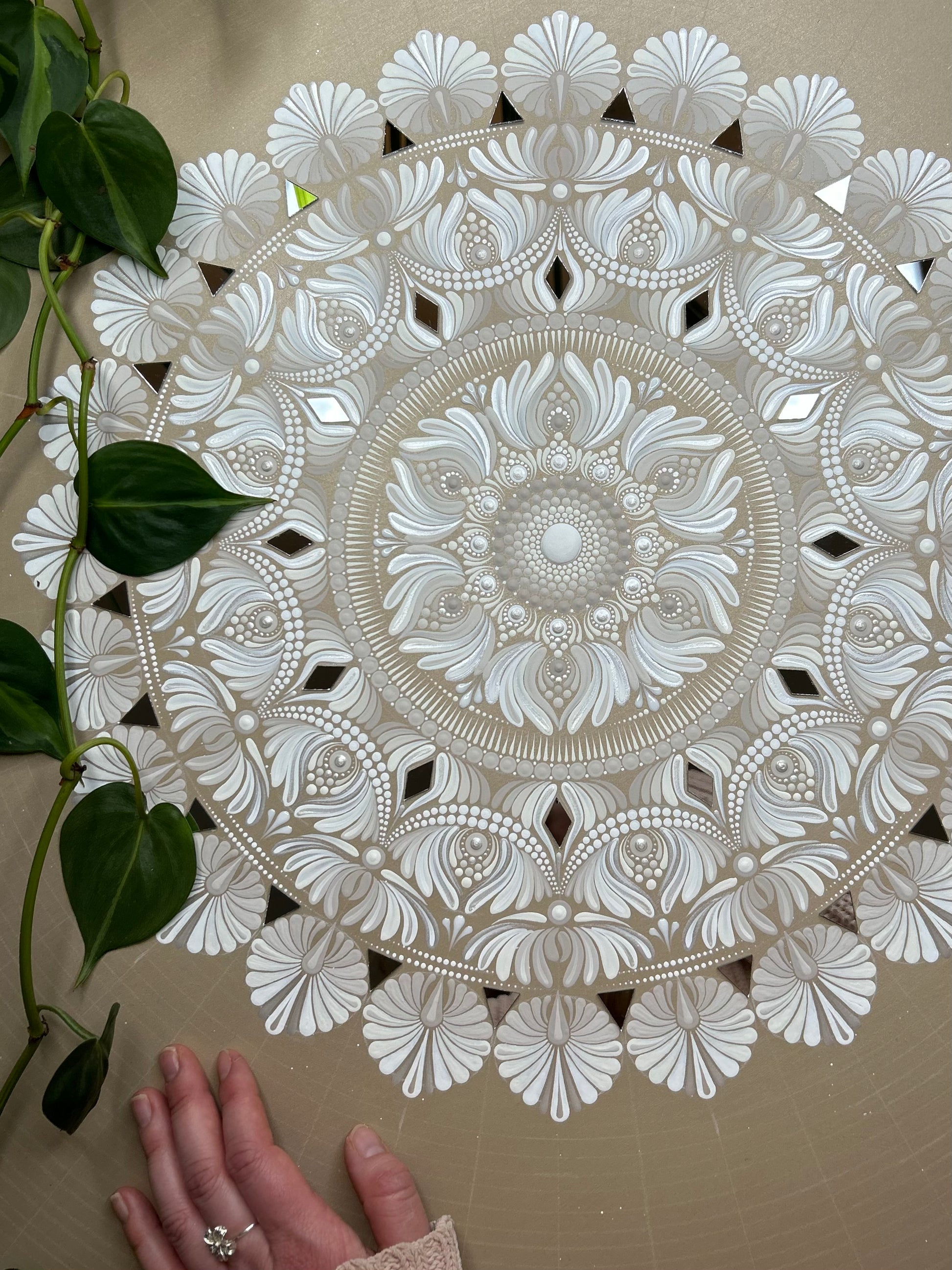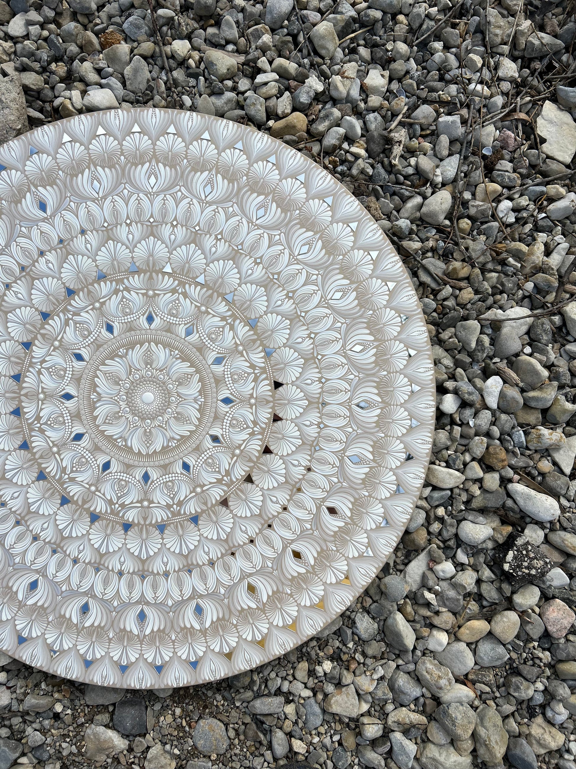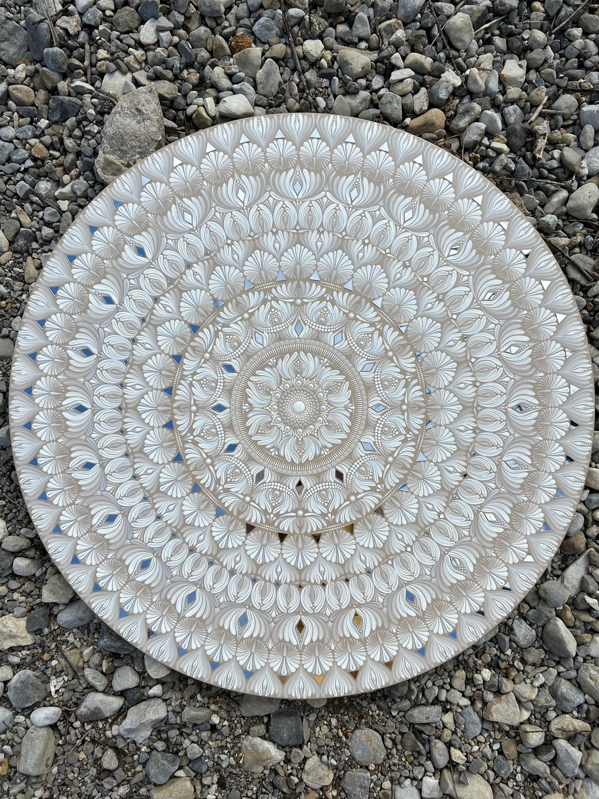 “Aurelia” is a 32” gold and white monochromatic mandala that feels both strong and peaceful. Its flowing patterns invite you to get lost in the movement, balancing order with a sense of freedom.